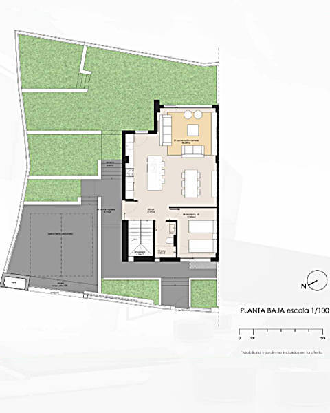 На первом этаже просторная гостиная с выходом в садик и к бассейну, и оборудованной кухней американкой, спальня и ванная комната.