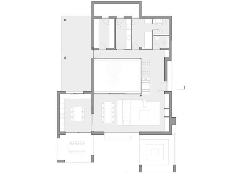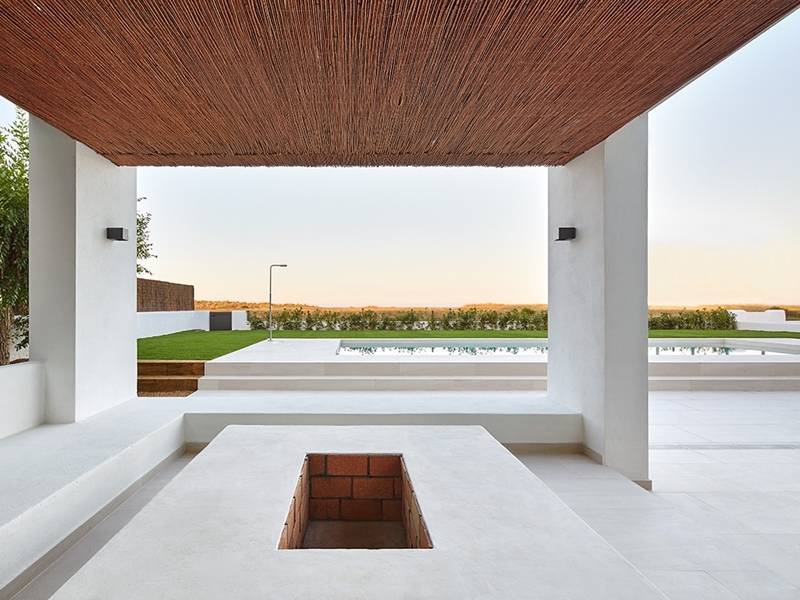 На первом этаже гостиная со столовой, камином и выходом к бассейну, оборудованная кухня-офис с островом и выходом на террасу с летней столовой, спальня с ванной комнатой, прачечная, кладовка и гостевой с/у.