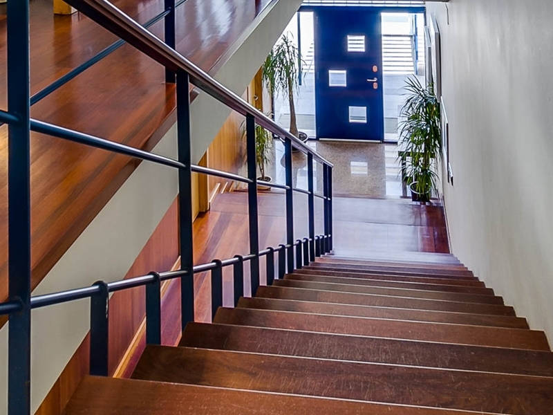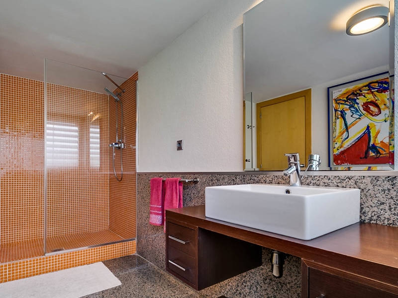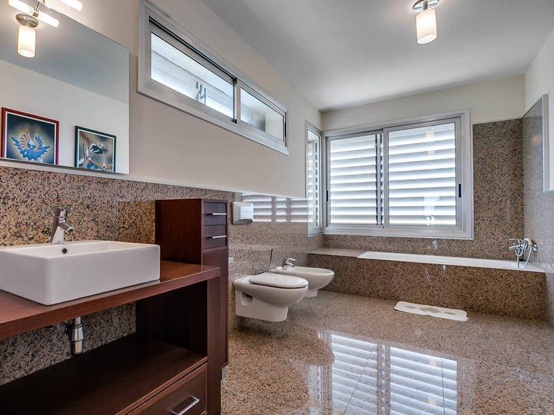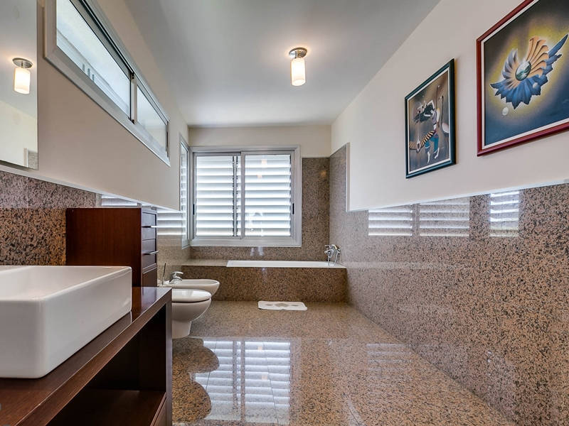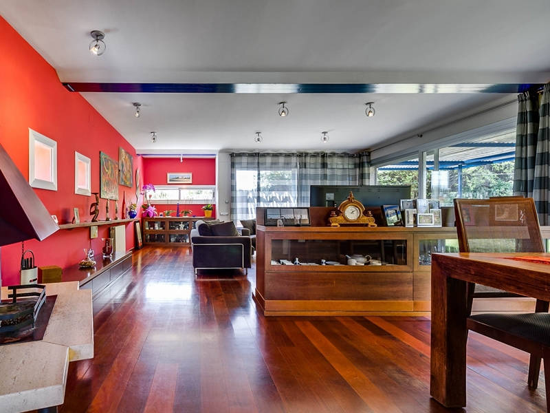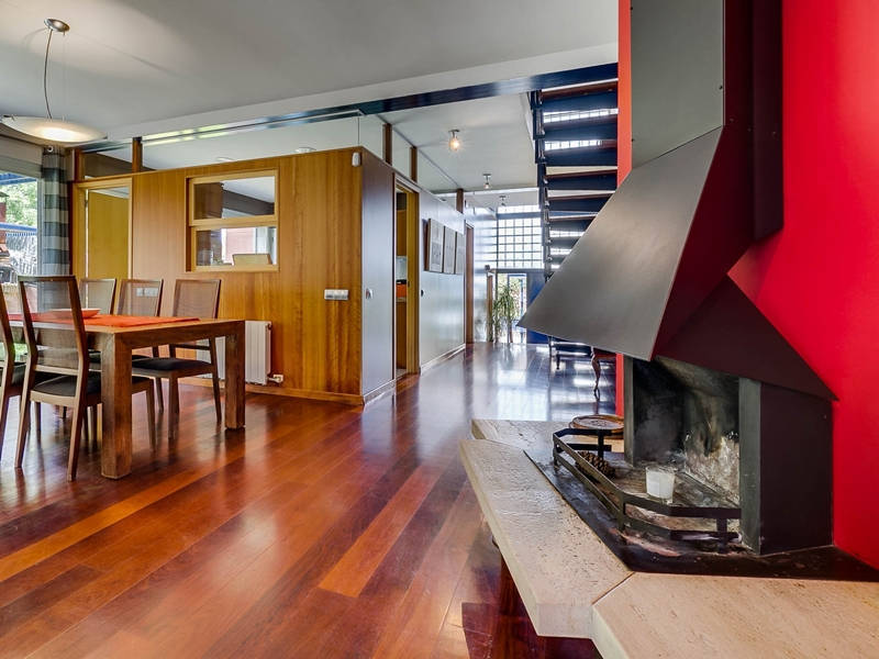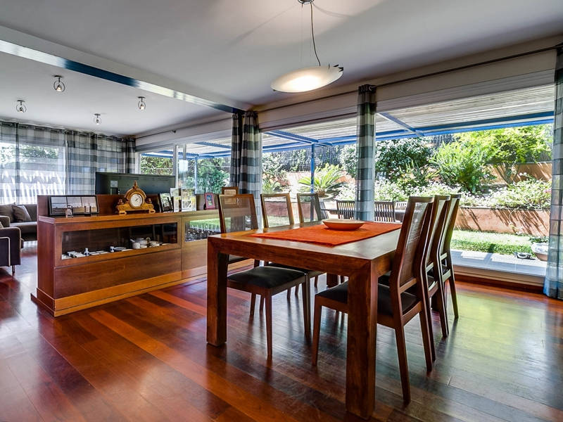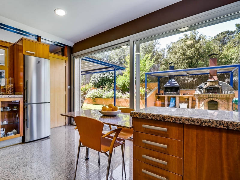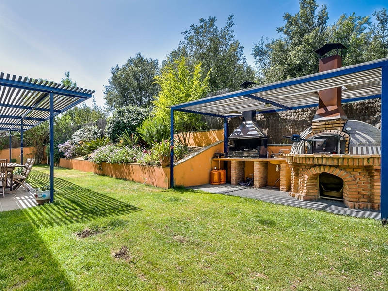 На первом этаже гостиная-столовая 70 кв.м. с камином и выходом в сад к бассейну, оборудованная и полностью экипированная кухня-офис 15 кв.м. с выходом в сад к ББК и дровяной печи, гостевой с/у.