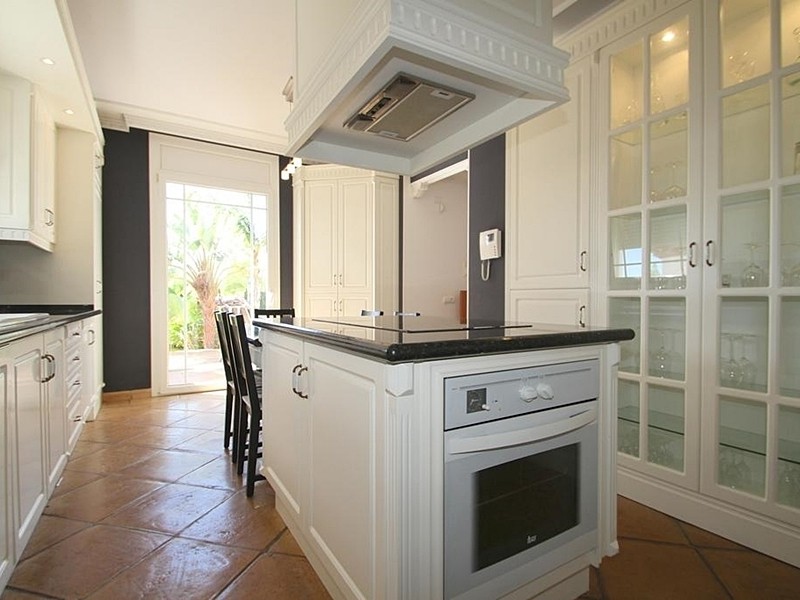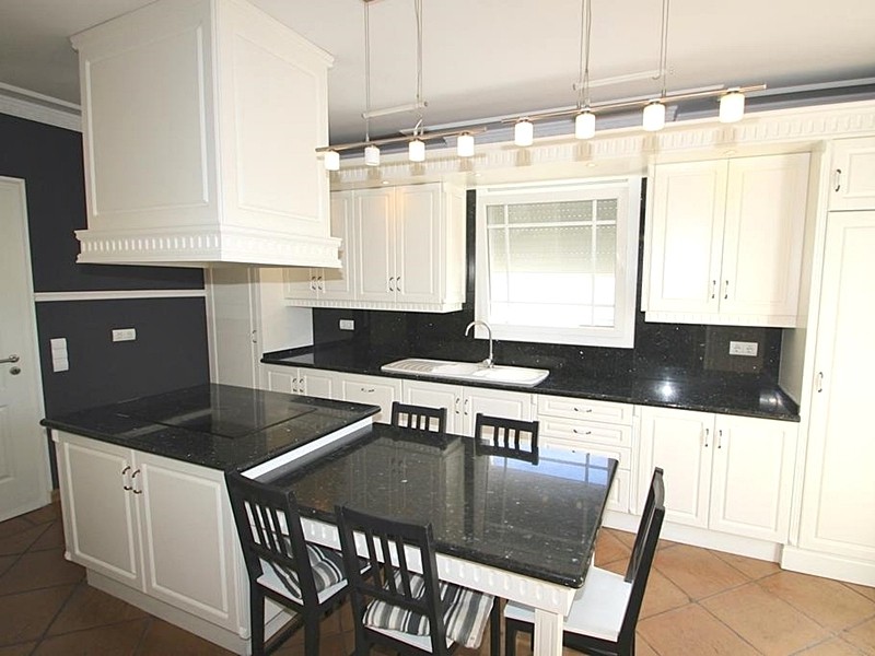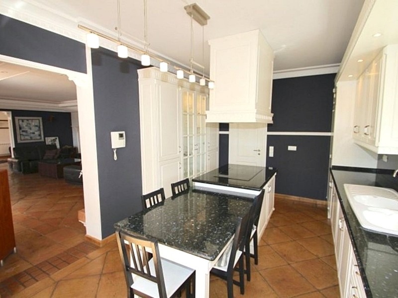 На первом этаже гостиная 40 кв.м. с камином, столовая с выходом на террасу с ББК, оборудованная кухня-офис с островом и проходом в двойной гараж 56 кв.м., две спальни, кабинет и ванная комната.