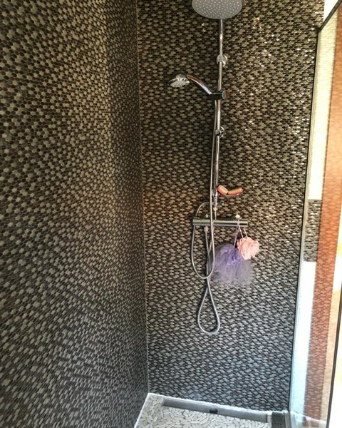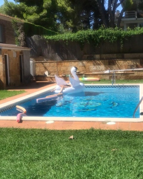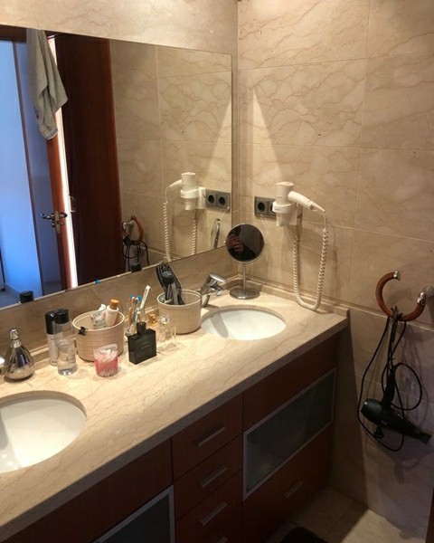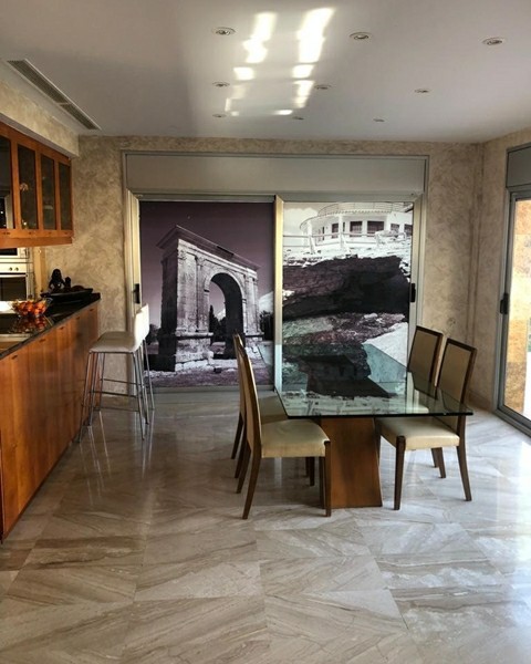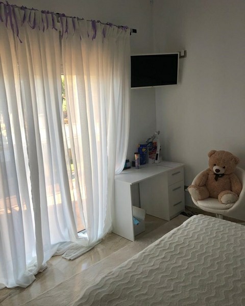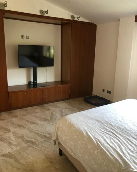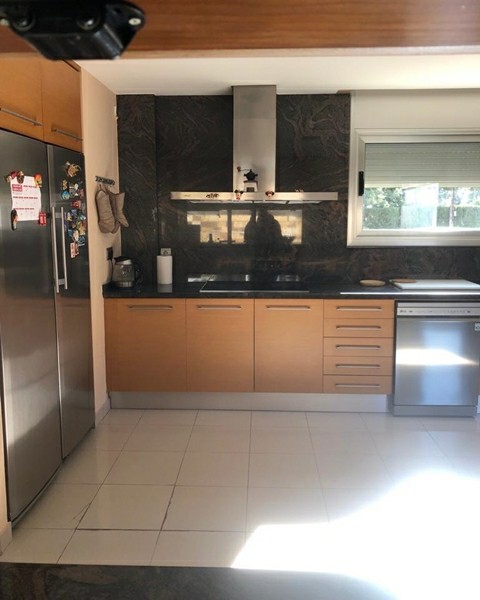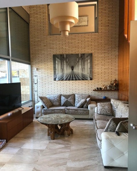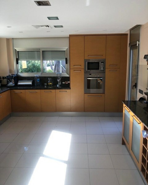 На первом этаже просторная гостиная с камином, столовой и выходом в сад к бассейну 54 кв.м., оборудованная кухня-американка, четыре супружеские спальни с ванной комнатой каждая в стиле гостиничных номеров и прачечная.