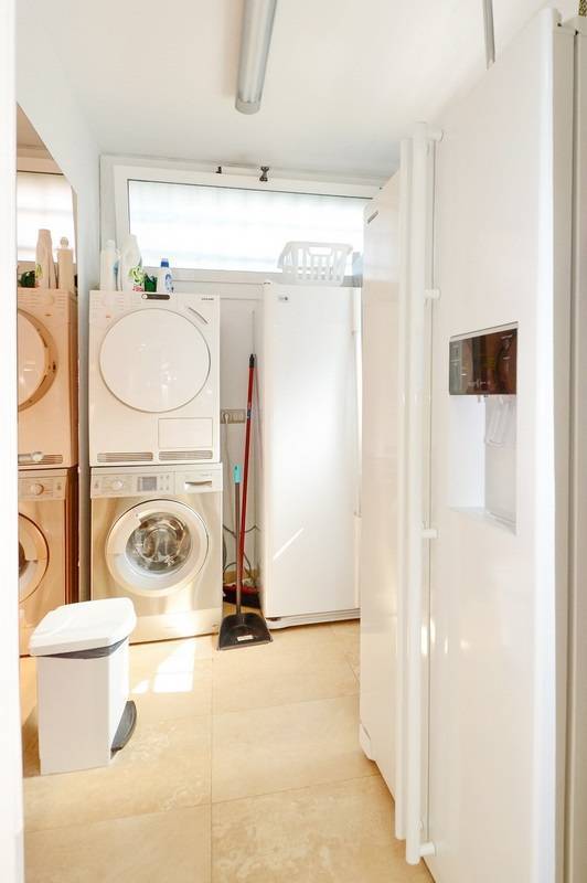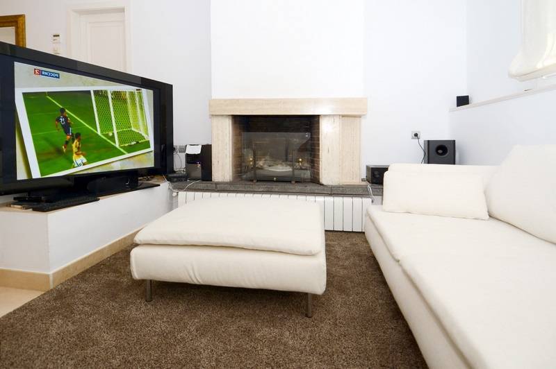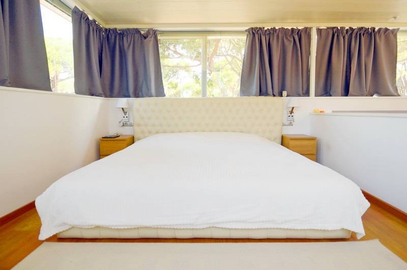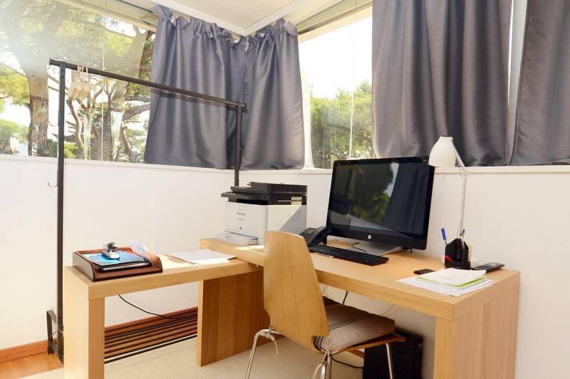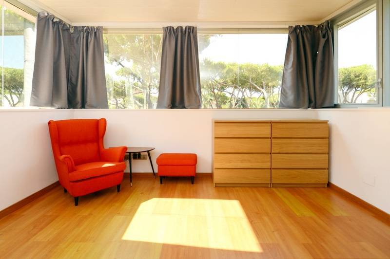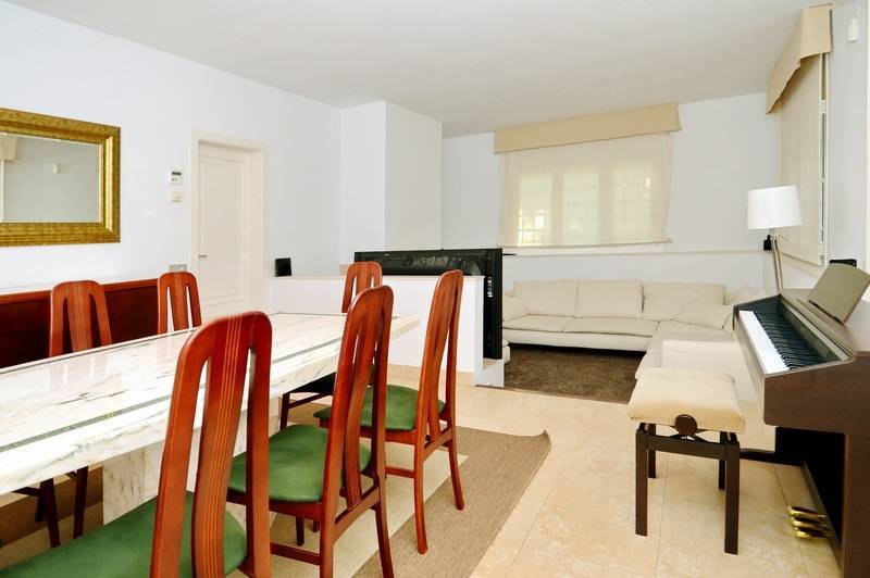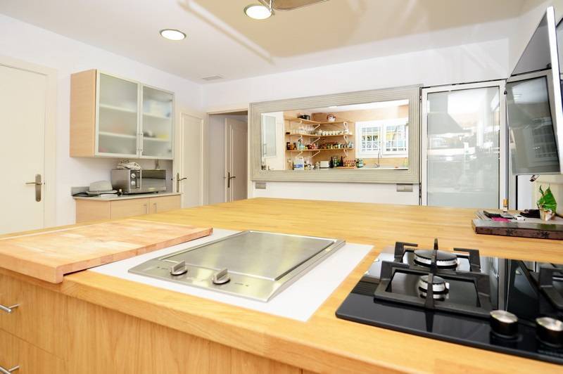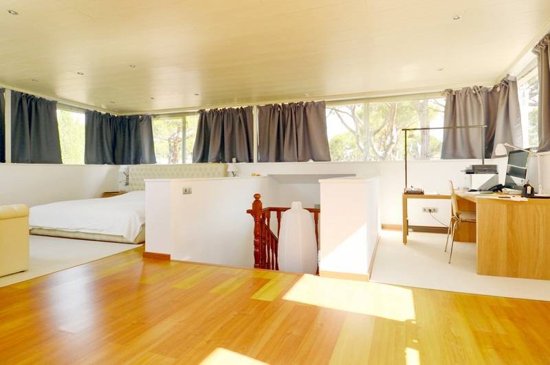 На нижнем этаже гостиная с камином, выходом к летней столовой с барбекю и к бассейну с солёной водой, полностью оборудованная и экипированная кухня, четыре супружеские спальни, три ванные комнаты и гостевой с/у.