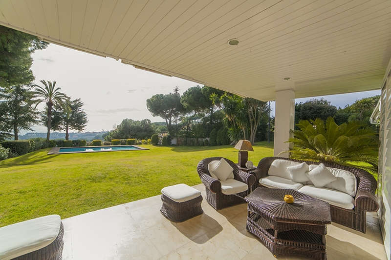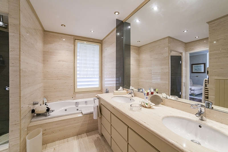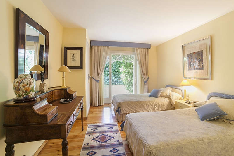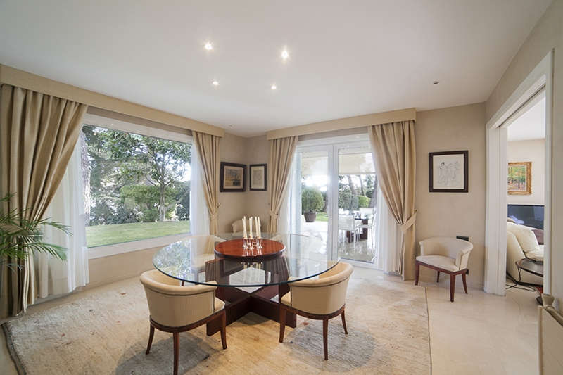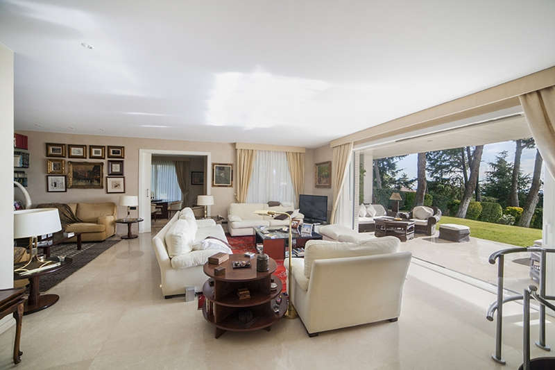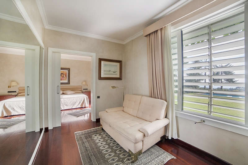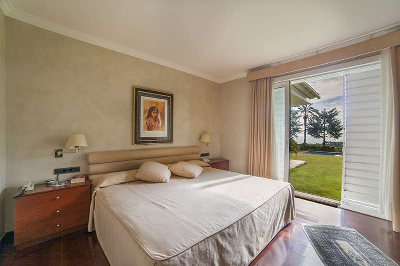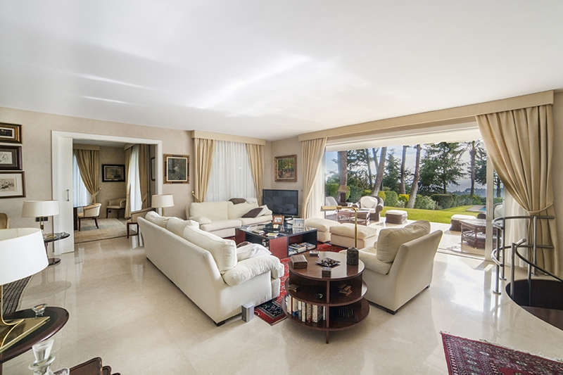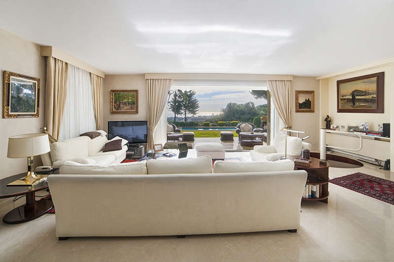 На первом этаже просторная гостиная со столовой 80 кв.м. с камином, выходом на веранду к бассейну и в ухоженный средиземноморский сад, основная супружеская спальня с гардеробом и ванной с гидромассажем, ещё пять супружеских спален с ванными комнатами, спальни для обсуживающего персонала, оборудованная и полностью экипированная кухня с прачечной.