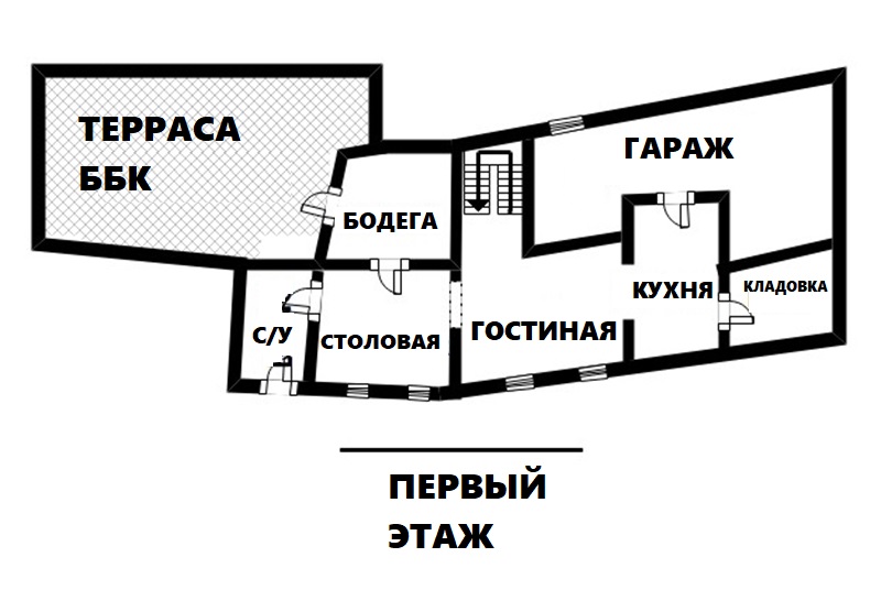 На первом этаже гостиная, столовая с камином, оборудованная кухня-офис с барбекю, кладовка, бодега, бойлерная, ванная комната и гараж.