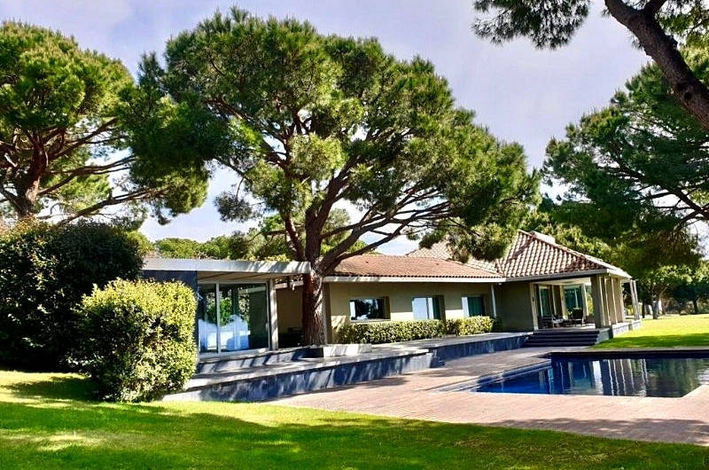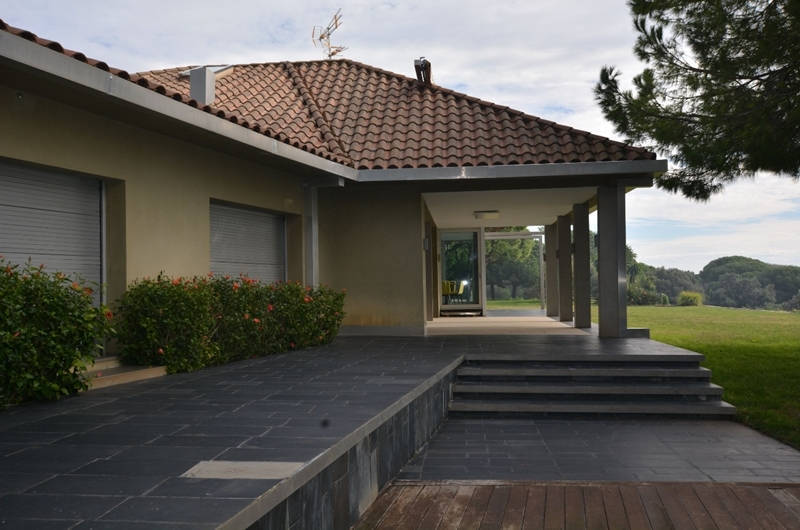 В одноэтажном доме площадью 345 кв.м. просторная гостиная с газовым камином и выходом на террасу, оборудованная кухня-офис с островом и выходом на террасу, супружеская спальня с гардеробом, ванной комнатой и кабинетом, ещё три спальни и ванная комната.