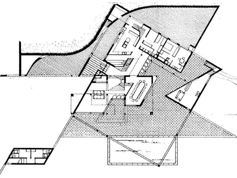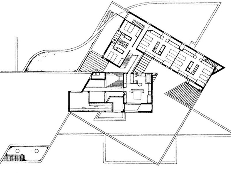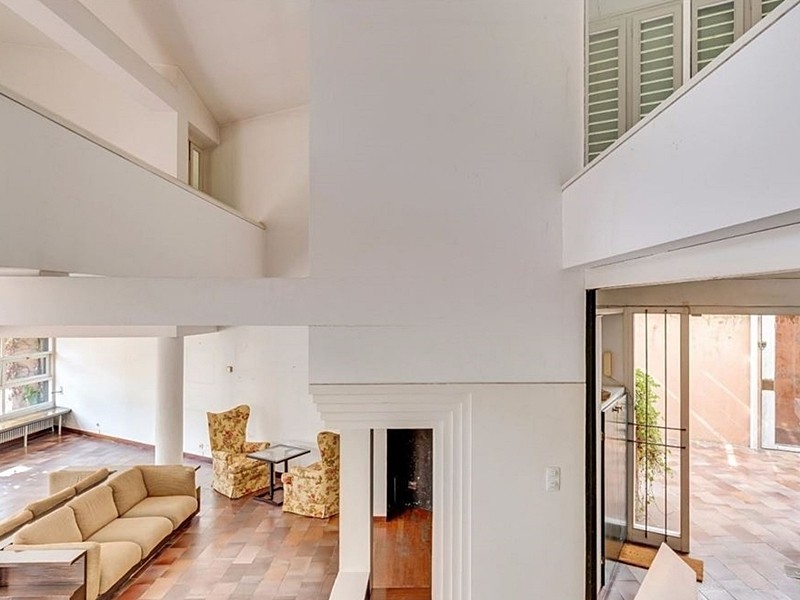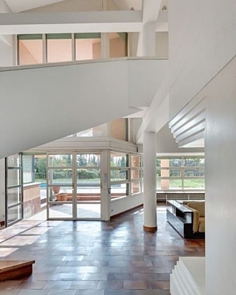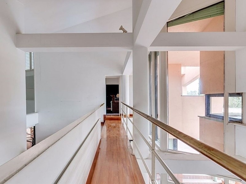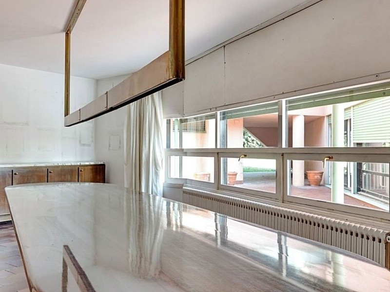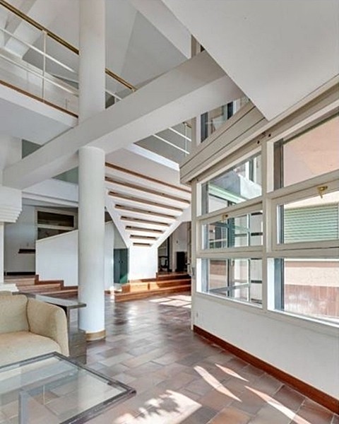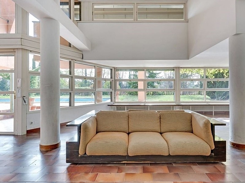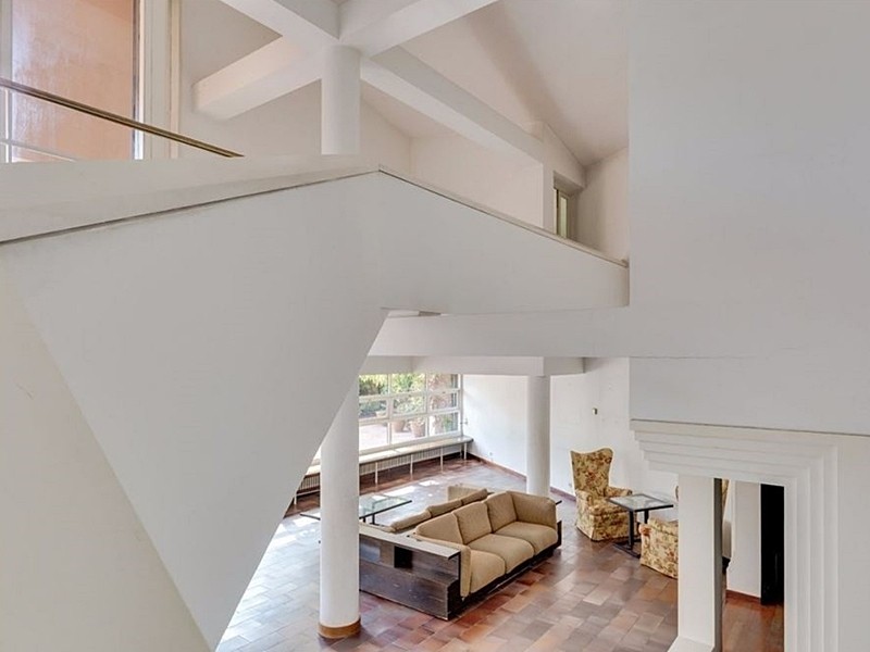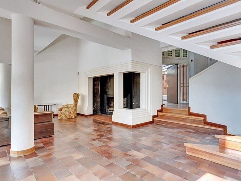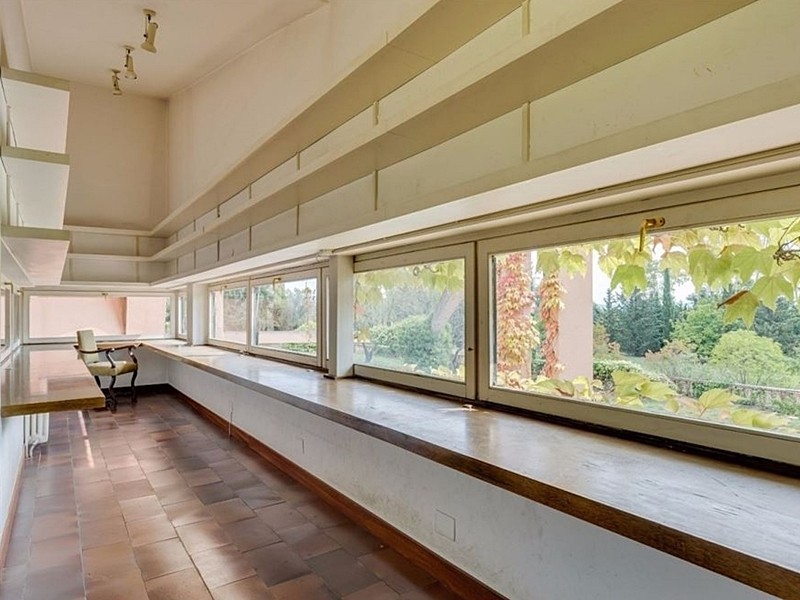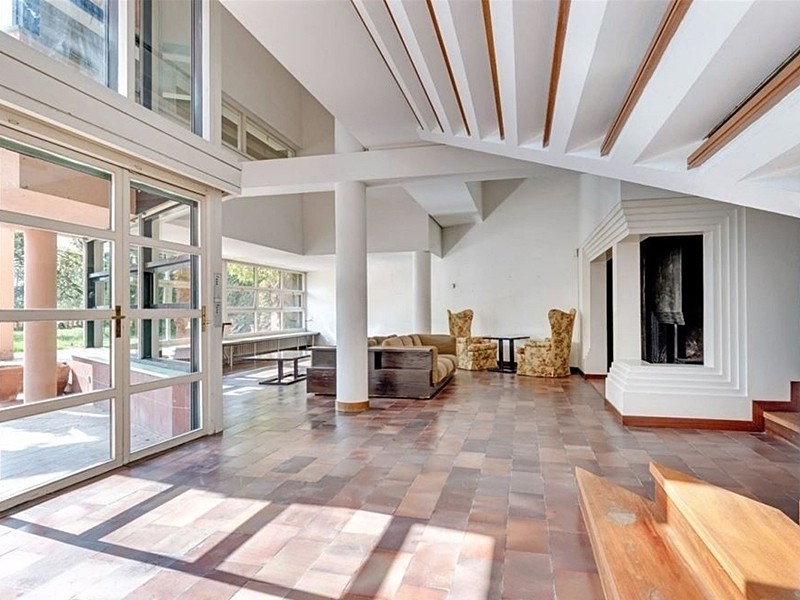 Просторная гостиная двойной высоты с камином и выходом к бассейну, столовая, оборудованная кухня, игровой зал, библиотека, семь супружеских спален с ванной комнатой каждая, три спальни и две ванные комнаты для обслуживающего персонала, вспомогательные помещения и гостевой с/у.