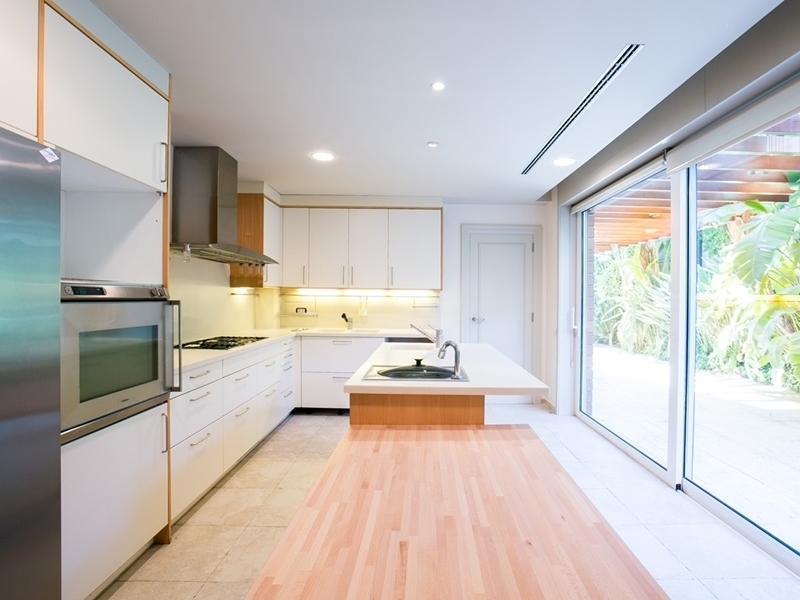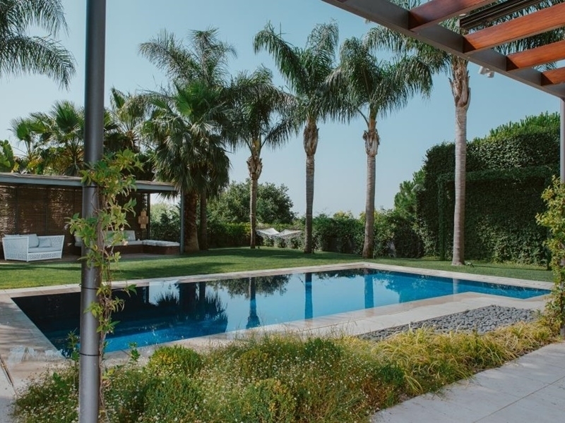 В ухоженном саду с экзотическими пальмами переливной бассейн с подогревом, пергола, душ и с/у, подсветка и орошение.
