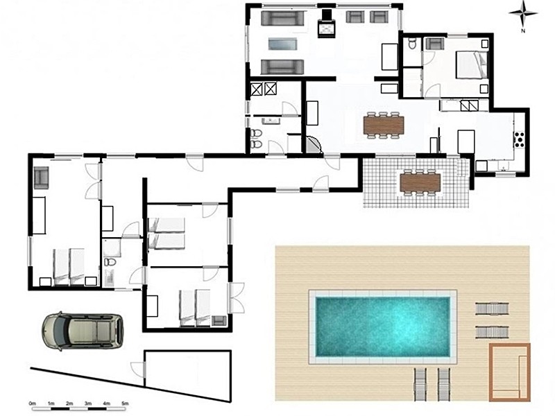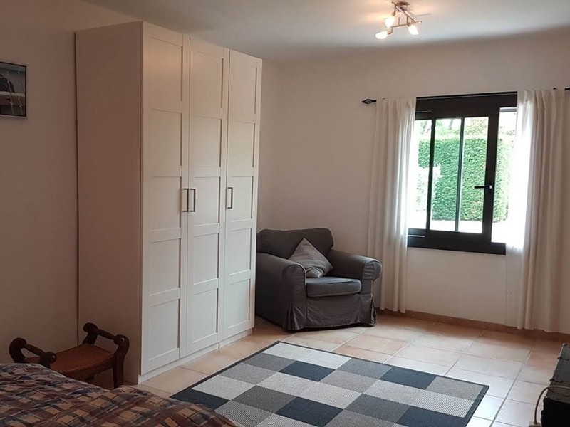 Просторная гостиная с камином, столовая, оборудованная кухня-офис, супружеская спальня с ванной комнатой, ещё три спальни и ванная комната, гостевой с/у, прачечная, кладовая.