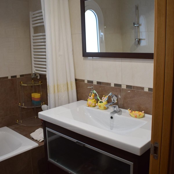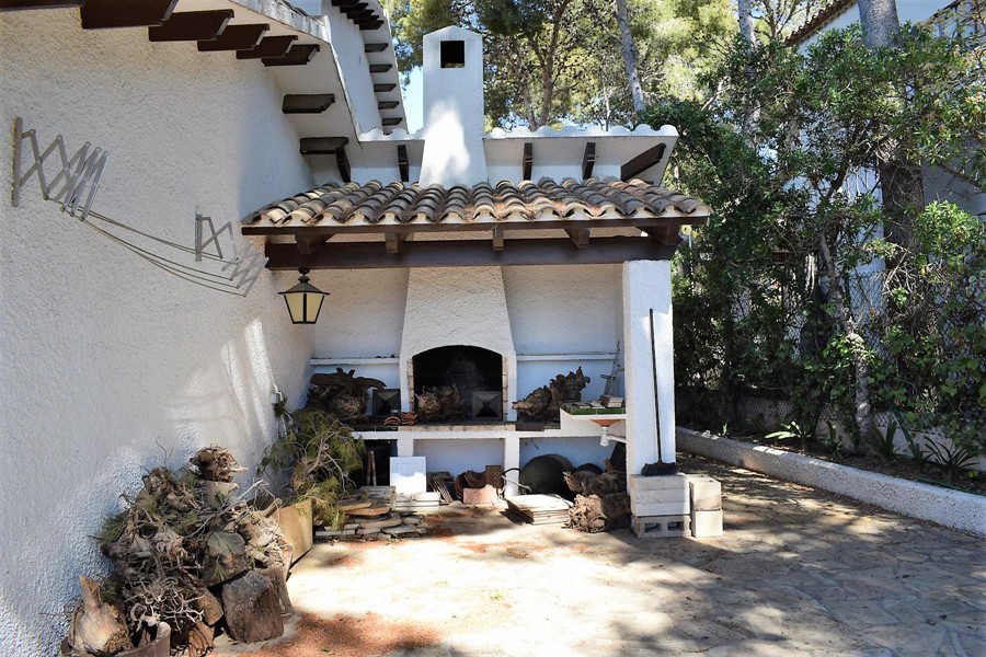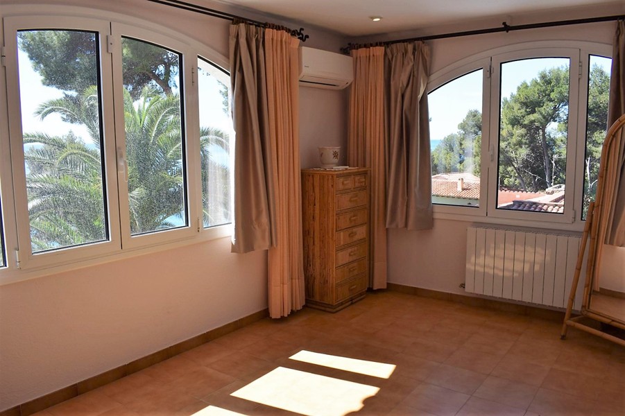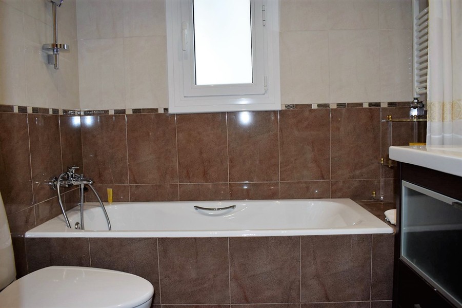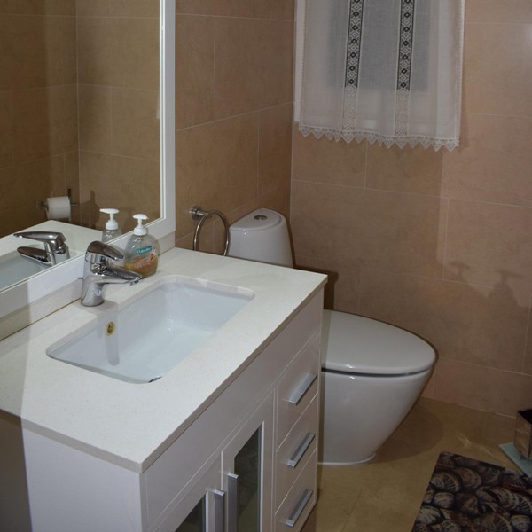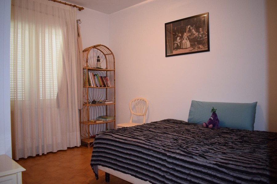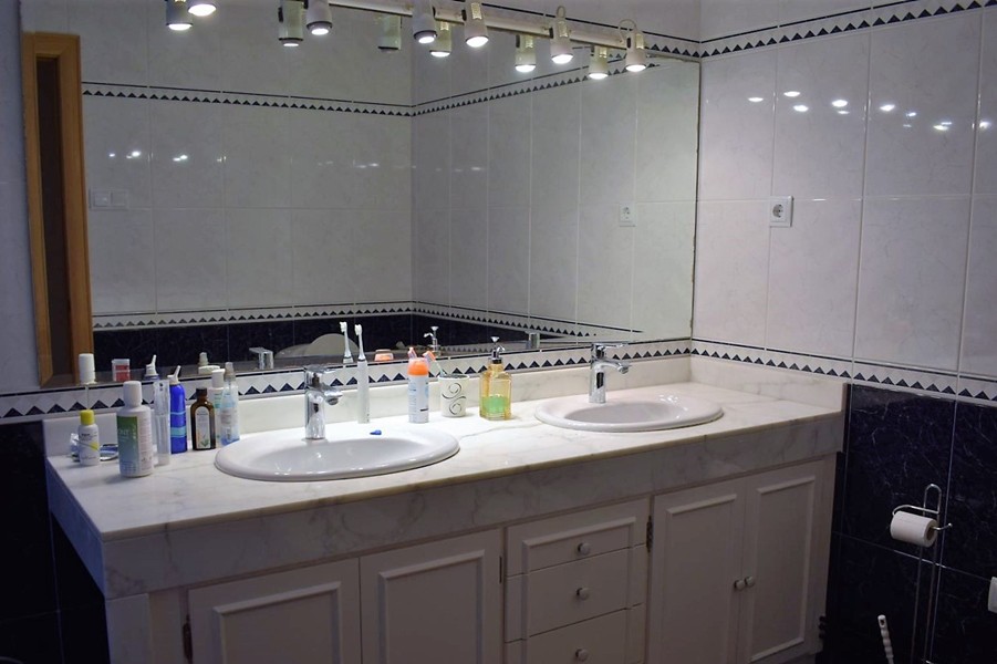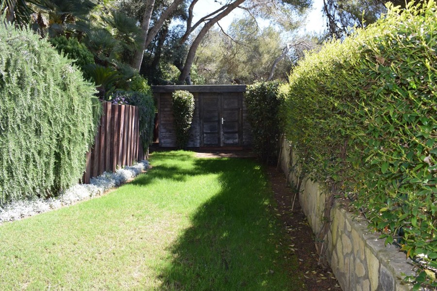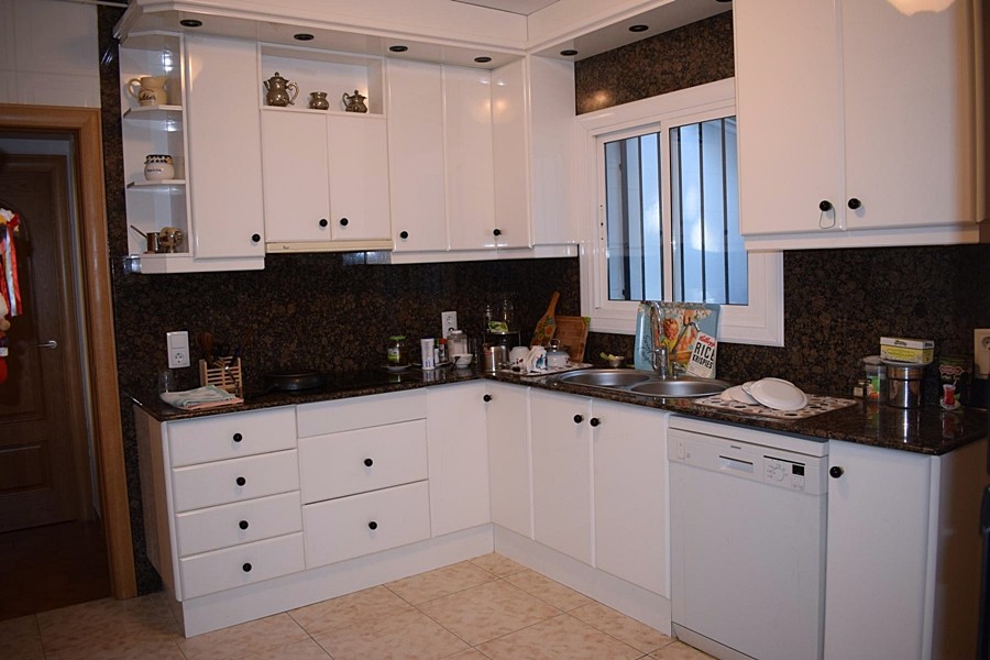 На первом этаже просторная гостиная 50 кв.м. с камином, столовой и выходом в сад к крытому бассейну, оборудованная кухня 12 кв.м., две спальни, кабинет, две ванные комнаты, прачечная и гараж.