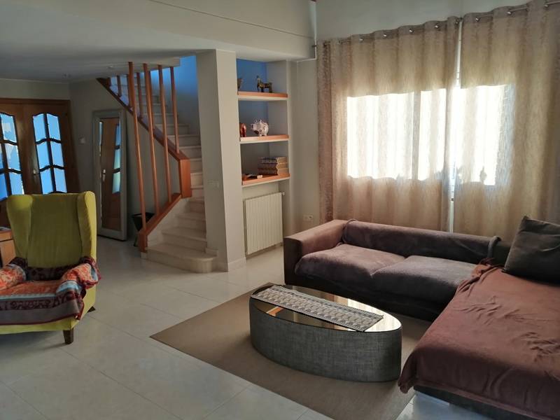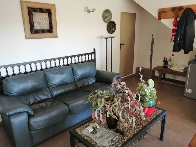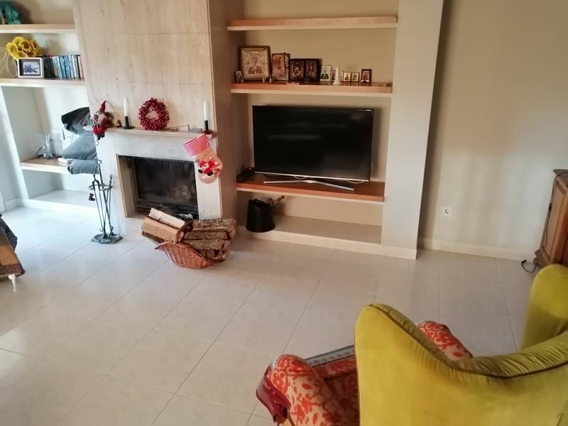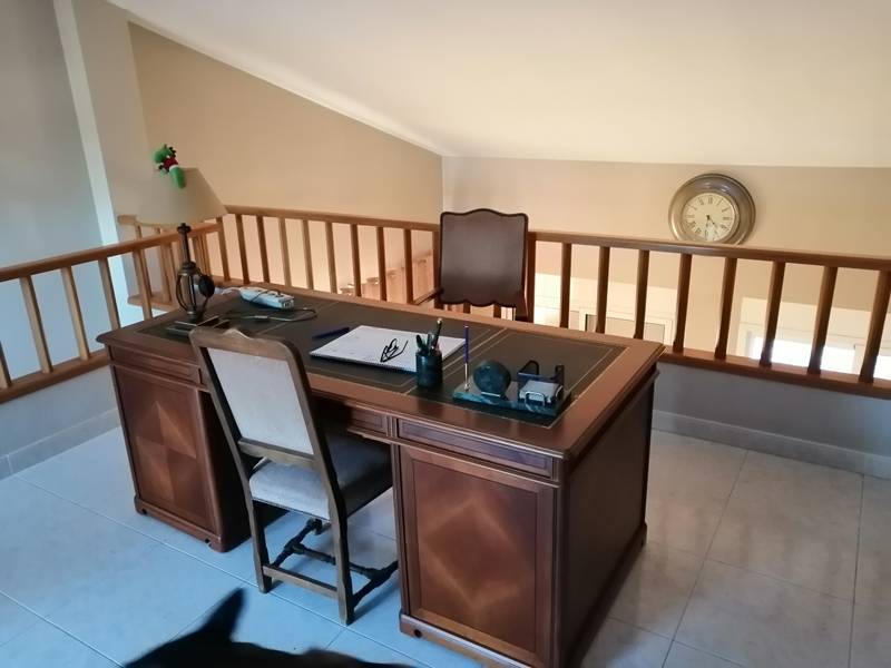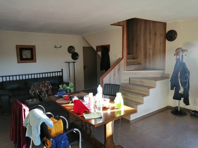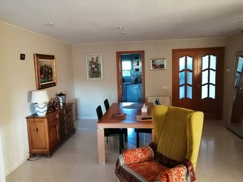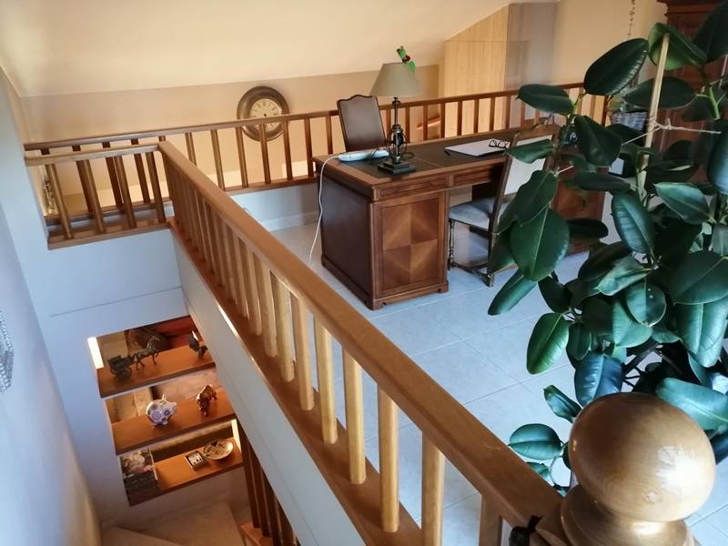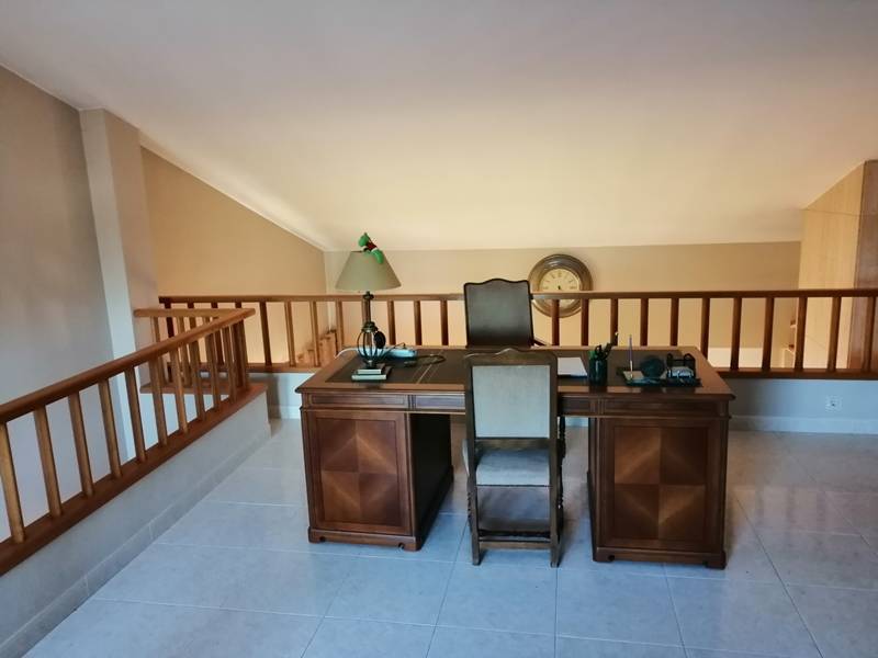 На первом этаже гостиная-столовая с камином и выходом на террасу c видом на сад, бассейн и Пиренеи.