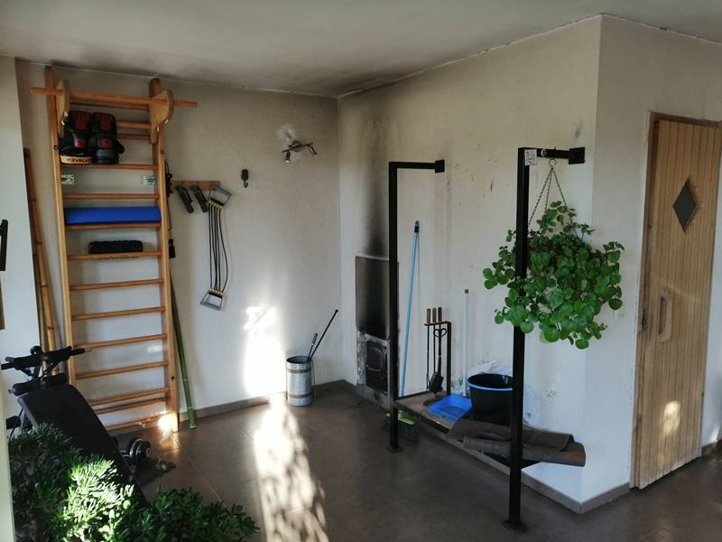 В цокольном этаже поливалентный зал с выходом в сад и к бассейну, спортзал и сауна.