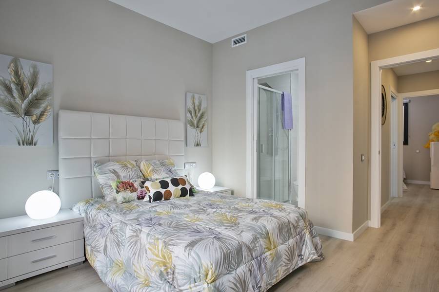Гостиная с выходом на балкон, супружеская спальня с ванной комнатой, ещё две спальни и ванная комната, оборудованная кухня-американка.