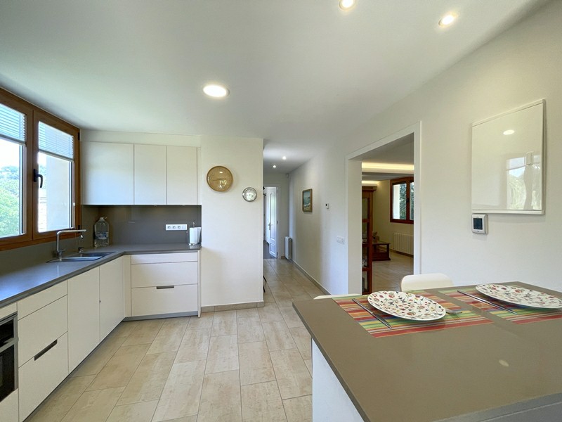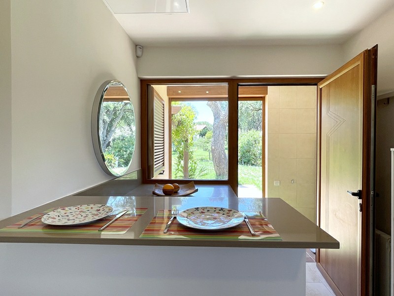 В основном двухэтажном здании в цокольном этаже этаже располагается просторная гостиная с камином и выходом на террасу, в сад с барбекю и к бассейну, супружеская спальня с гардеробной и ванной комнатой, кухня с островом и столовой, кладовка и гостевой с/у.